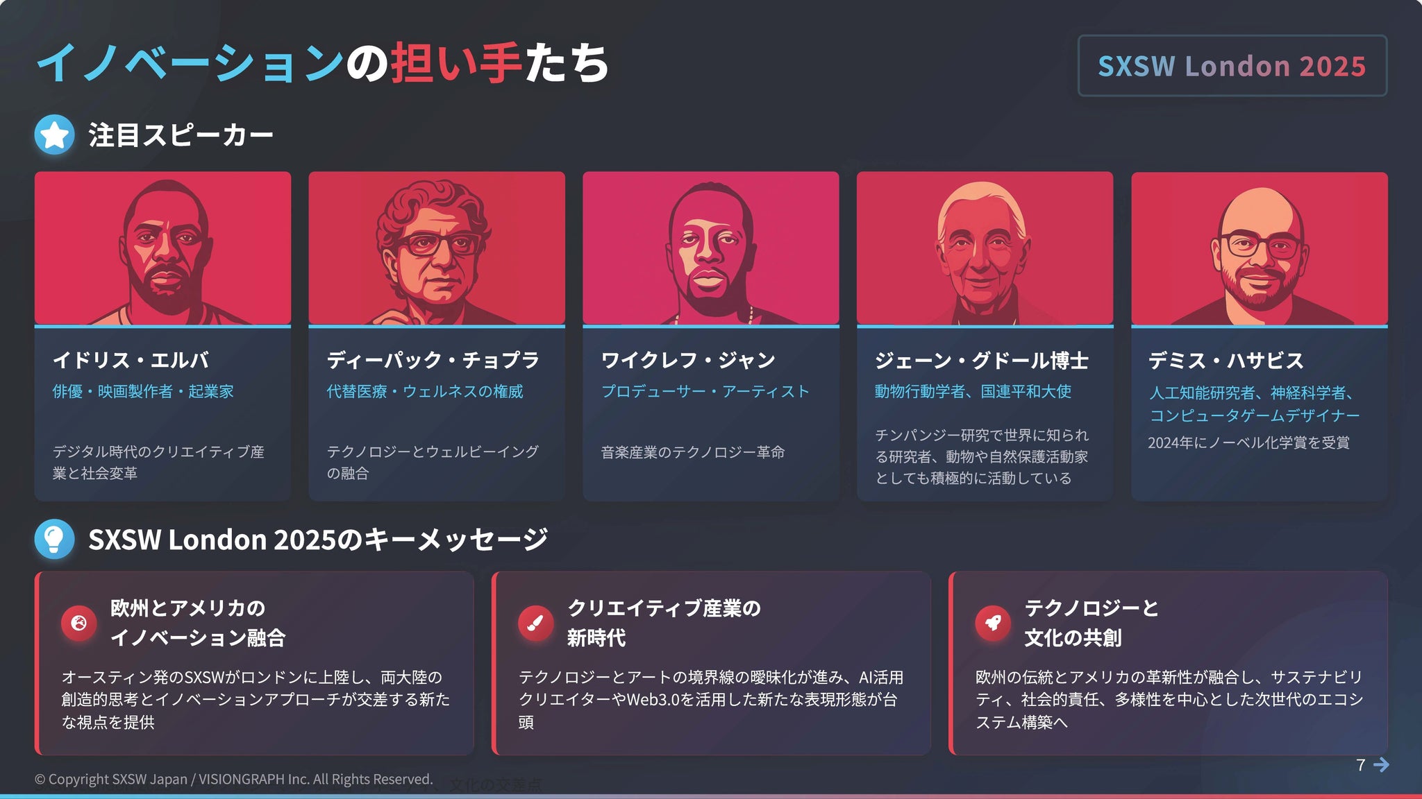 単なるセッション要約や出展紹介にとどまらず、日欧の価値観のズレや、これからの創造性・共創・ガバナンスのあり方までを深掘り。日本企業にとっての示唆や展開可能性も明快に整理しています。SXSW Londonの“その場に行けばわかる熱気”を、戦略と思想の言葉で持ち帰りたい方へ。知的好奇心と構想力に火をつける、唯一無二のレポートです。